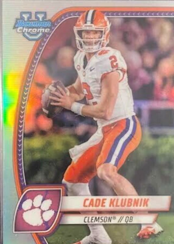 This card is 1 of 17 Cade Klubnik's card variations in the 2024 Bowman Chrome University set being tracked by Sports Card Investor, including Prospect Auto, Prospect Auto - Stealth Refractor, Prospect Auto - Refractor /299, Prospect Auto - Fuchsia Refractor /150, and Prospect Auto - Green Refractor /99.