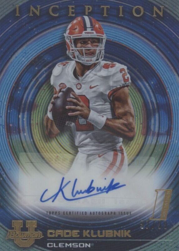 This card is 1 of 7 Cade Klubnik's card variations in the 2022 Bowman University Inception set being tracked by Sports Card Investor, including Autographs (1st), Autographs - Fuchsia Foil /75 (1st), Autographs - Gold Foil /50 (1st), Autographs - Orange Foil /25 (1st), and Autographs - Red Foil /5 (1st).