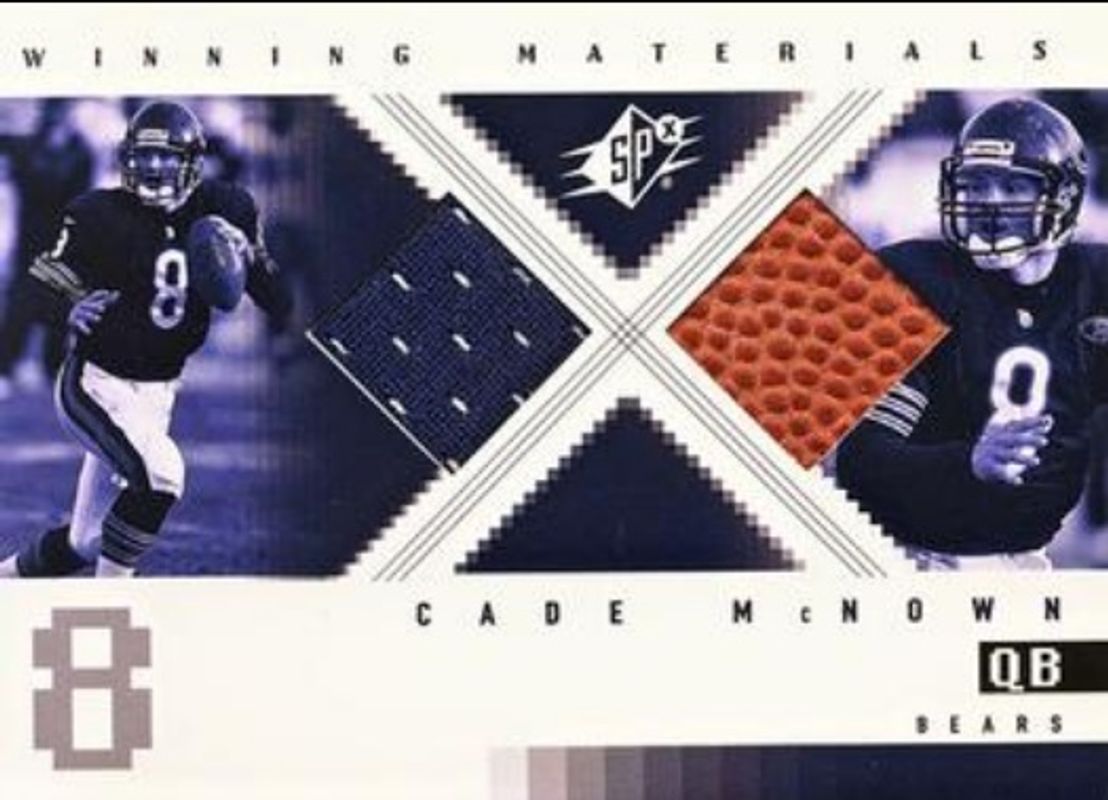 The Cade McNown 2000 SPx #WM-CM Winning Materials card is 1 of 4 Cade McNown's card variations in the 2000 SPx set being tracked by Sports Card Investor, including Base /1350, Spectrum /25, and SPxtreme.