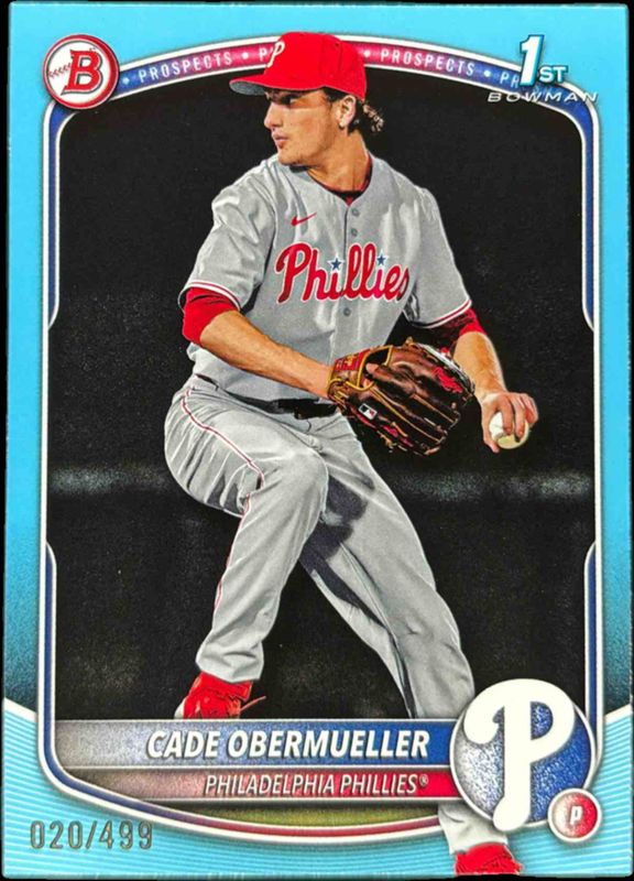 The Cade Obermueller 2025 Bowman Draft #BD-80 Sky Blue Border /499 card is 1 of 85 Cade Obermueller's card variations in the 2025 Bowman Draft set being tracked by Sports Card Investor, including Base, Chrome, Chrome - Lazer Refractor, Chrome - Refractor, and Chrome - Sky Blue Refractor.