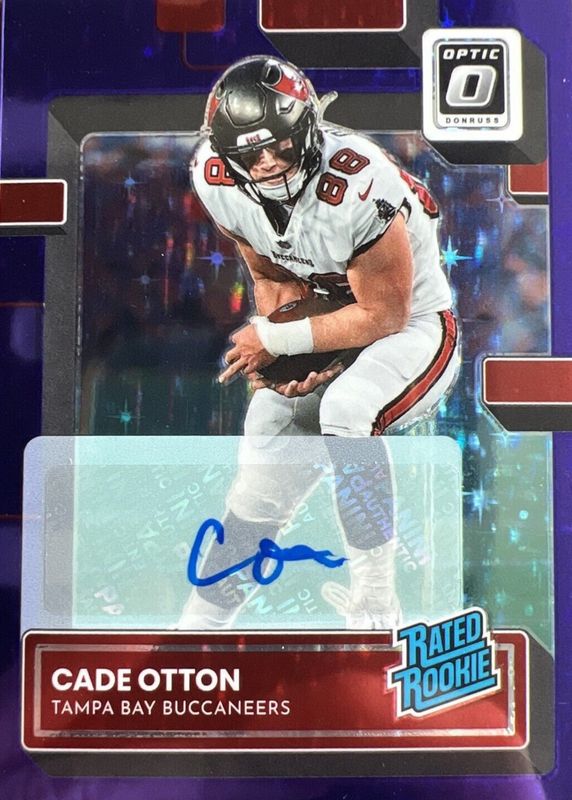 The Cade Otton 2022 Optic #293 Rated Rookie Autographs - Purple Stars (/10) card in Raw condition has not changed in price in the last 30 days and was last sold for $12.50 .