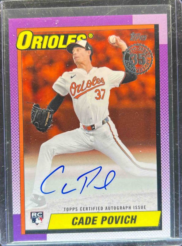 The Cade Povich 2025 Topps #90A-CP 1990 Baseball Autographs (Series 1) - Orange /25 Rookie card is 1 of 129 Cade Povich's card variations in the 2025 Topps set being tracked by Sports Card Investor, including Base, Aqua Holo Foil, Diamante Foil, Holo Foil, and Pink Diamante Foil.