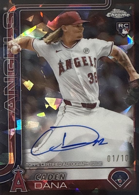 This card is 1 of 7 Caden Dana's card variations in the 2025 Topps Chrome Sapphire Edition set being tracked by Sports Card Investor, including Rookie Autographs /199, Rookie Autographs - Green /99, Rookie Autographs - Gold /50, Rookie Autographs - Orange /25, and Rookie Autographs - Red /5.
