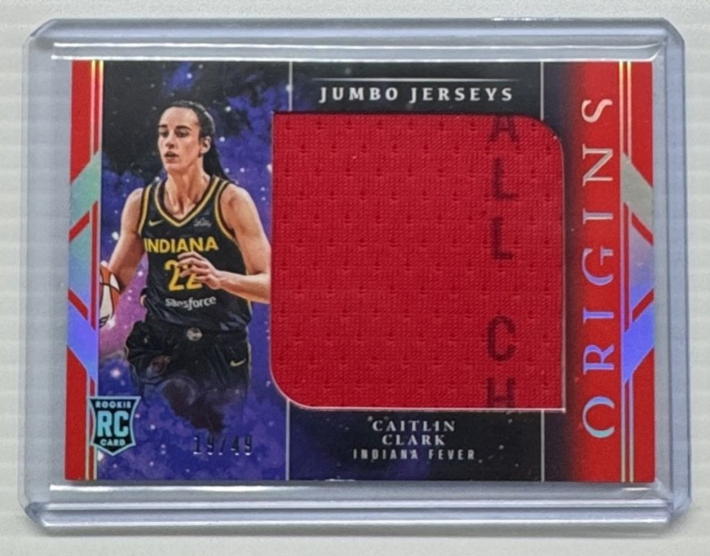 The Caitlin Clark 2024 Origins WNBA #JJ-CC Jumbo Jerseys - Red /49 Rookie card is 1 of 36 Caitlin Clark's card variations in the 2024 Origins WNBA set being tracked by Sports Card Investor, including Base, Red /99, Blue /75, Swirl /(SSP), and Teal /49.