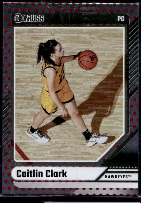 The Caitlin Clark 2024 Panini Caitlin Clark Collection #12 Donruss Base - Dot Rookie card is 1 of 710 Caitlin Clark's card variations in the 2024 Panini Caitlin Clark Collection set being tracked by Sports Card Investor, including #AS1 Artistic Selections, #AS2 Artistic Selections, #CC Autographs, #CC Autographs - Gold Vinyl, and #CL3 Campus Legends.