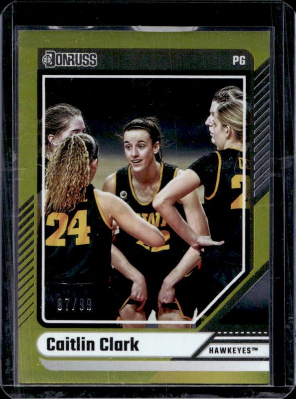 The Caitlin Clark 2024 Panini Caitlin Clark Collection #2 Donruss Base - Gold /99 Rookie card is 1 of 710 Caitlin Clark's card variations in the 2024 Panini Caitlin Clark Collection set being tracked by Sports Card Investor, including #AS1 Artistic Selections, #AS2 Artistic Selections, #CC Autographs, #CC Autographs - Gold Vinyl, and #CL3 Campus Legends.