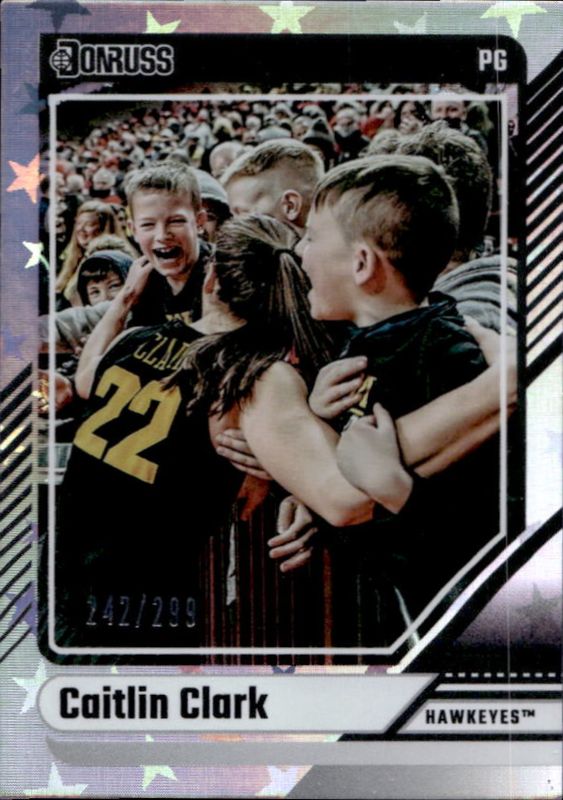 The Caitlin Clark 2024 Panini Caitlin Clark Collection #20 Donruss Base - Pointed Stars /299 Rookie card is 1 of 710 Caitlin Clark's card variations in the 2024 Panini Caitlin Clark Collection set being tracked by Sports Card Investor, including #AS1 Artistic Selections, #AS2 Artistic Selections, #CC Autographs, #CC Autographs - Gold Vinyl, and #CL3 Campus Legends.