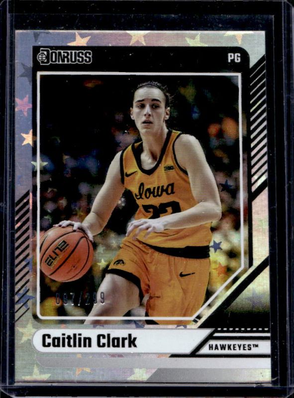 The Caitlin Clark 2024 Panini Caitlin Clark Collection #4 Donruss Base - Pointed Stars /299 Rookie card is 1 of 710 Caitlin Clark's card variations in the 2024 Panini Caitlin Clark Collection set being tracked by Sports Card Investor, including #AS1 Artistic Selections, #AS2 Artistic Selections, #CC Autographs, #CC Autographs - Gold Vinyl, and #CL3 Campus Legends.