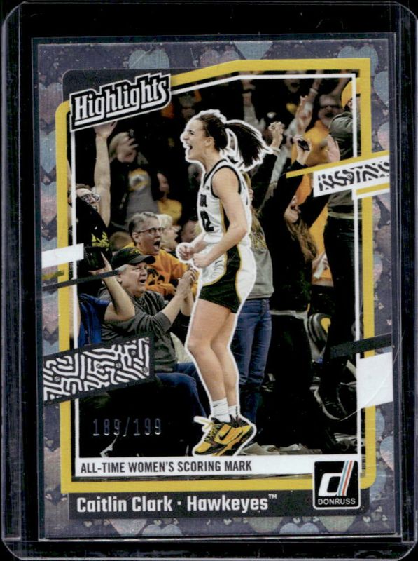 The Caitlin Clark 2024 Panini Caitlin Clark Collection #H10 Highlights - Floating Hearts /199 Rookie card is 1 of 710 Caitlin Clark's card variations in the 2024 Panini Caitlin Clark Collection set being tracked by Sports Card Investor, including #AS1 Artistic Selections, #AS2 Artistic Selections, #CC Autographs, #CC Autographs - Gold Vinyl, and #CL3 Campus Legends.