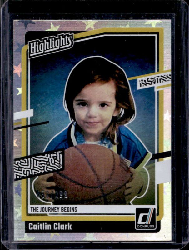 The Caitlin Clark 2024 Panini Caitlin Clark Collection #H1 Highlights - Pointed Stars /299 Rookie card is 1 of 710 Caitlin Clark's card variations in the 2024 Panini Caitlin Clark Collection set being tracked by Sports Card Investor, including #AS1 Artistic Selections, #AS2 Artistic Selections, #CC Autographs, #CC Autographs - Gold Vinyl, and #CL3 Campus Legends.