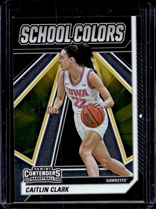 The Caitlin Clark 2024 Panini Caitlin Clark Collection #SC4 School Colors - Metalized Rookie card is 1 of 710 Caitlin Clark's card variations in the 2024 Panini Caitlin Clark Collection set being tracked by Sports Card Investor, including #AS1 Artistic Selections, #AS2 Artistic Selections, #CC Autographs, #CC Autographs - Gold Vinyl, and #CL3 Campus Legends.