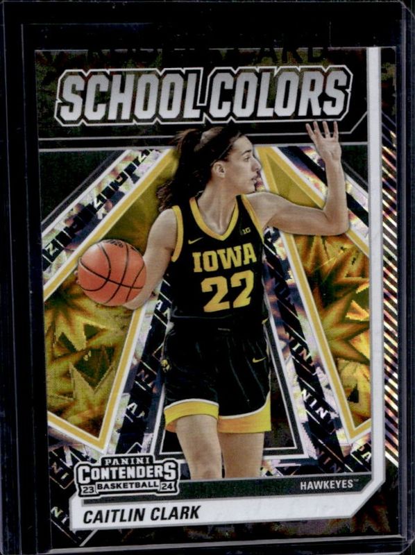 The Caitlin Clark 2024 Panini Caitlin Clark Collection #SC1 School Colors - Panini Rookie card is 1 of 710 Caitlin Clark's card variations in the 2024 Panini Caitlin Clark Collection set being tracked by Sports Card Investor, including #AS1 Artistic Selections, #AS2 Artistic Selections, #CC Autographs, #CC Autographs - Gold Vinyl, and #CL3 Campus Legends.