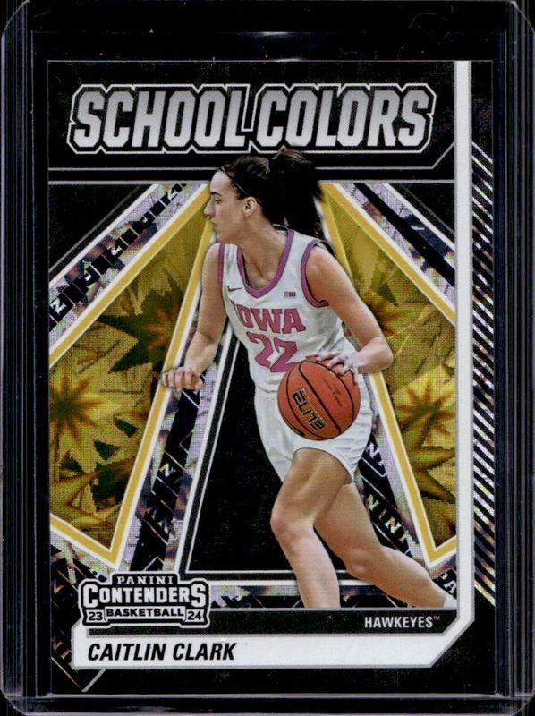 The Caitlin Clark 2024 Panini Caitlin Clark Collection #SC4 School Colors - Panini Rookie card is 1 of 710 Caitlin Clark's card variations in the 2024 Panini Caitlin Clark Collection set being tracked by Sports Card Investor, including #AS1 Artistic Selections, #AS2 Artistic Selections, #CC Autographs, #CC Autographs - Gold Vinyl, and #CL3 Campus Legends.