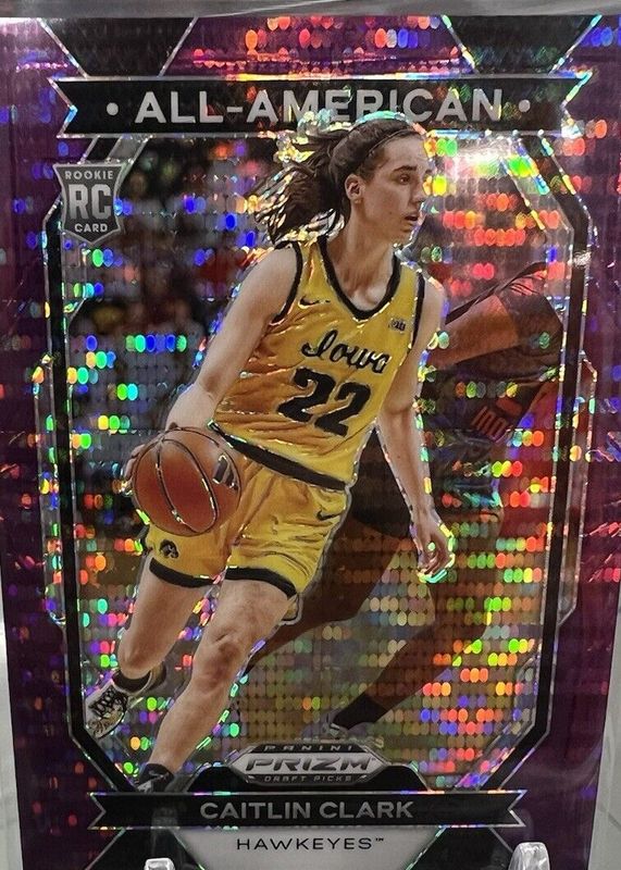The Caitlin Clark 2024 Prizm Draft Picks #23 All-American - Purple Pulsar /55 Rookie card in Raw condition has not changed in price in the last 30 days and was last sold for $103.50 .