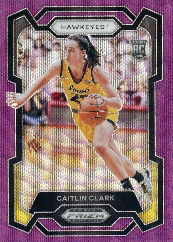 The Caitlin Clark 2024 Prizm Draft Picks #57 Purple Wave Rookie card in Raw condition has moved down -$8.53 (-35.5%) in the last 30 days and was last sold for $15.50 .