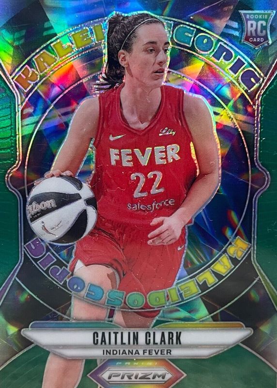 The Caitlin Clark 2024 Prizm WNBA #9 Kaleidoscopic - Green Rookie card in Raw condition has not changed in price in the last 30 days and was last sold for $85.00 .