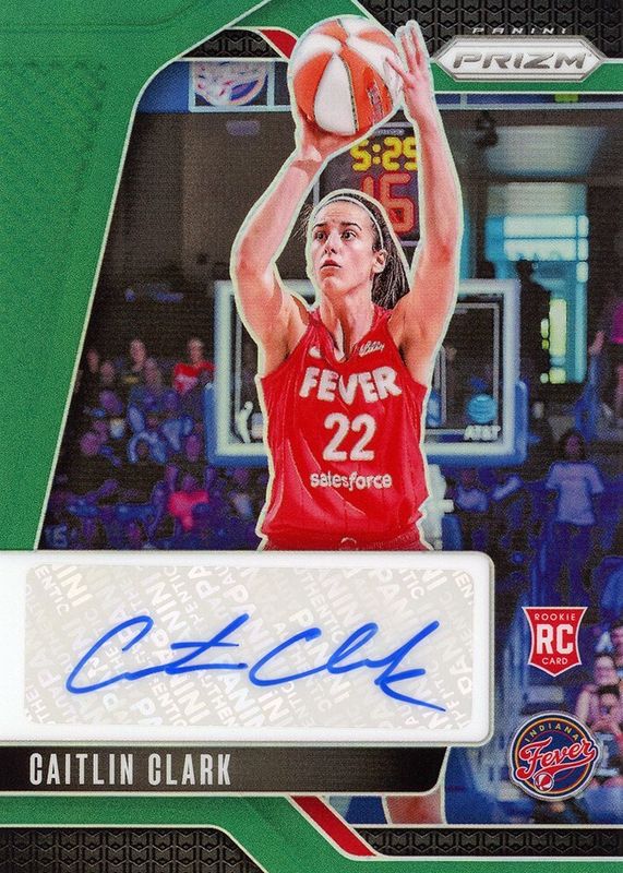 The Caitlin Clark 2024 Prizm WNBA #SG-CC Signatures - Green Rookie card in Raw condition has not changed in price in the last 30 days and was last sold for $2,200.00 .