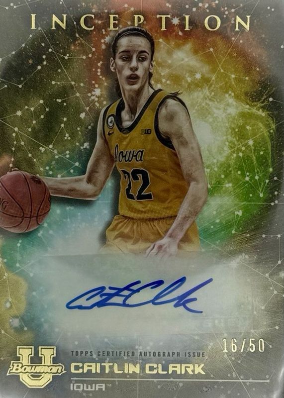 Auctions Ending Soon for Caitlin Clark 2022 Bowman University Inception #PMP-CC Primordial Prospect Autographs - Gold Foil /50 RAW