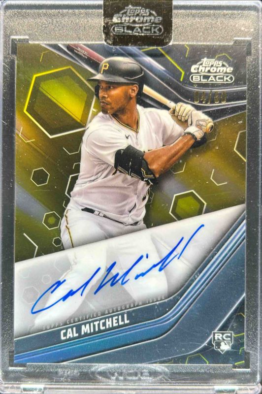 The Cal Mitchell 2023 Topps Chrome Black #CBA-CMI Autographs - Gold Refractor /50 Rookie card is 1 of 8 Cal Mitchell's card variations in the 2023 Topps Chrome Black set being tracked by Sports Card Investor, including Autographs, Autographs - Refractor /150, Autographs - Green Refractor /99, Autographs - Gold Mini Diamond Refractor /50, and Autographs - Orange Refractor /25.