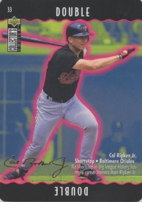 The Cal Ripken, Jr. 1996 Upper Deck Collector's Choice #33b You Make the Play Gold Signatures card is 1 of 32 Cal Ripken, Jr.'s card variations in the 1996 Upper Deck Collector's Choice set being tracked by Sports Card Investor, including #1 Base, #362 Base, #1 Gold Signatures, #362 Gold Signatures, and #1 Silver Signatures.