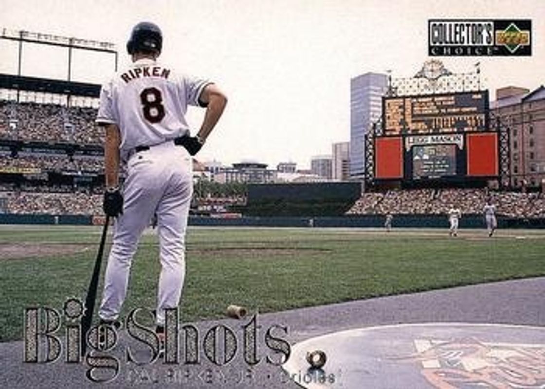 The Cal Ripken, Jr. 1997 Upper Deck Collector's Choice #8 Big Shots card is 1 of 20 Cal Ripken, Jr.'s card variations in the 1997 Upper Deck Collector's Choice set being tracked by Sports Card Investor, including Base, All Star Connection, Big Shots 5x7, Big Shots Gold Signatures, and Box Toppers.