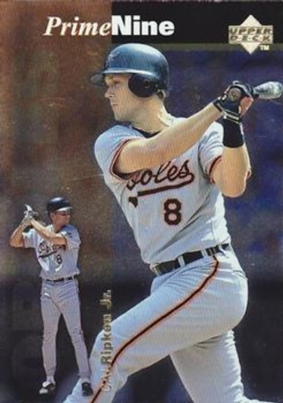 The Cal Ripken, Jr. 1998 Upper Deck #PN29 Prime Nine card is 1 of 21 Cal Ripken, Jr.'s card variations in the 1998 Upper Deck set being tracked by Sports Card Investor, including #310 Base, #614 Base, #145 Base, #40 10th Anniversary Preview, and #40 10th Anniversary Preview Edition Retail.