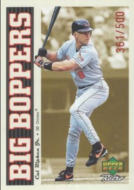 The Cal Ripken, Jr. 1998 Upper Deck Retro #B3 Big Boppers /500 card is 1 of 6 Cal Ripken, Jr.'s card variations in the 1998 Upper Deck Retro set being tracked by Sports Card Investor, including Base, Groovy Kind of Glove, Lunchboxes, Time Capsule, and Quantum Leap /50.