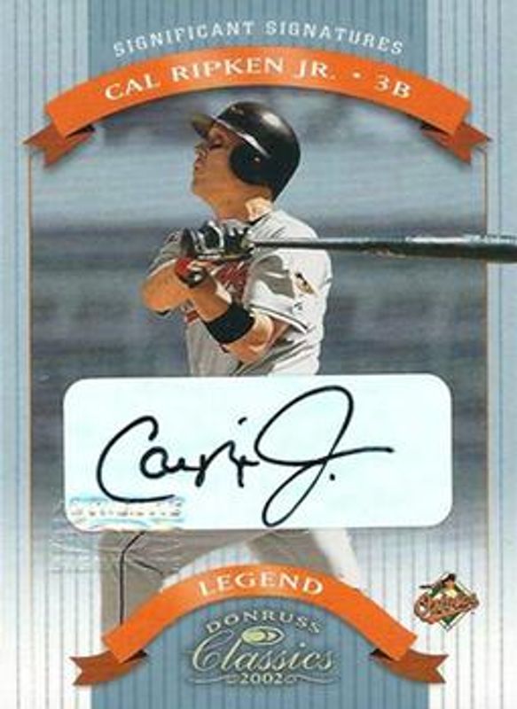 The Cal Ripken Jr. 2002 Donruss Classics #174 Significant Signatures /100 card is 1 of 15 Cal Ripken Jr.'s card variations in the 2002 Donruss Classics set being tracked by Sports Card Investor, including Base /1500, Timeless Tributes /100, Chicago National /5, Legendary Lumberjacks /500, and Classic Singles /100.
