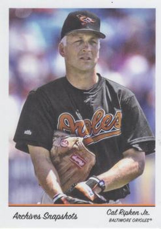 The Cal Ripken Jr. 2016 Topps Archives Snapshots #AS-CRJ Base card is 1 of 5 Cal Ripken Jr.'s card variations in the 2016 Topps Archives Snapshots set being tracked by Sports Card Investor, including Black & White, Autographs /350, Autographs - Black & White /10, and Autographs - Negative /5.