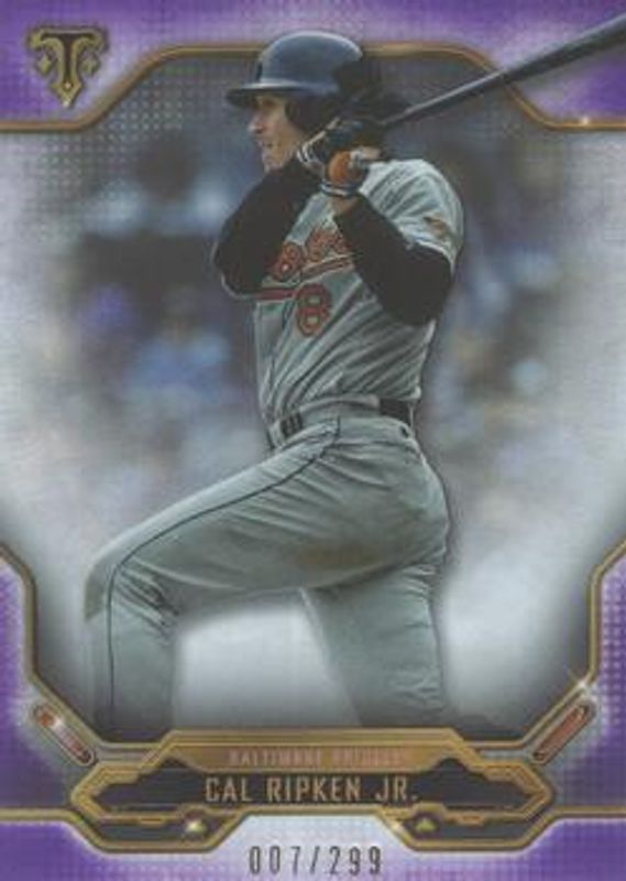 The Cal Ripken, Jr. 2020 Topps Triple Threads #9 Amethyst /299 card is 1 of 37 Cal Ripken, Jr.'s card variations in the 2020 Topps Triple Threads set being tracked by Sports Card Investor, including Base, Emerald /259, Amber /199, Gold /99, and Citrine /75.