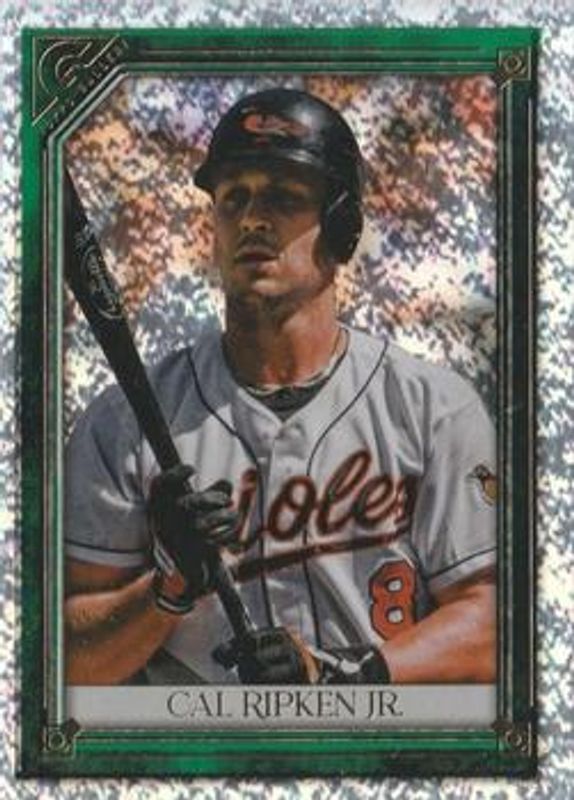 The Cal Ripken, Jr. 2021 Topps Gallery #50 Green Pattern /99 card is 1 of 20 Cal Ripken, Jr.'s card variations in the 2021 Topps Gallery set being tracked by Sports Card Investor, including Base, Printer Proof, Rainbow Foil, Private Issue /250, and Green /125.