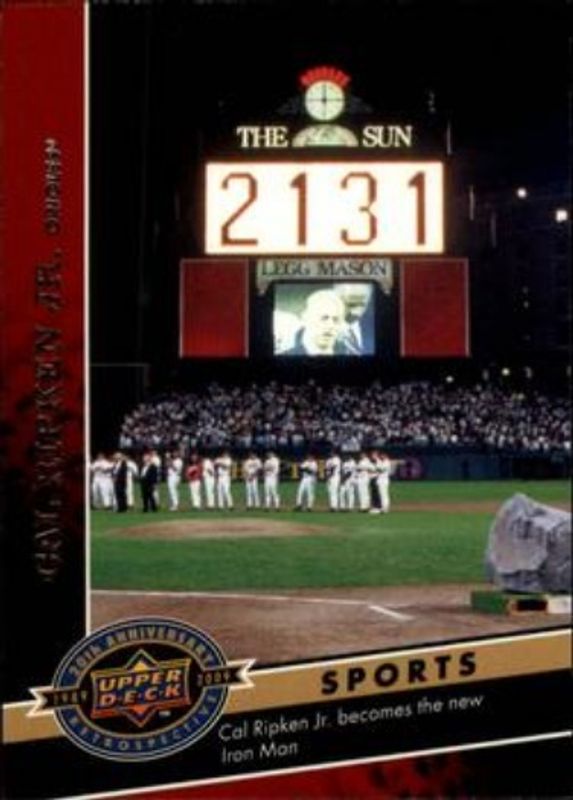 The Cal Ripken Jr. 2009 Upper Deck 20th Anniversary #806 Base card is 1 of 100 Cal Ripken Jr.'s card variations in the 2009 Upper Deck 20th Anniversary set being tracked by Sports Card Investor, including #1167 Base, #1168 Base, #1169 Base, #1170 Base, and #1331 Base.