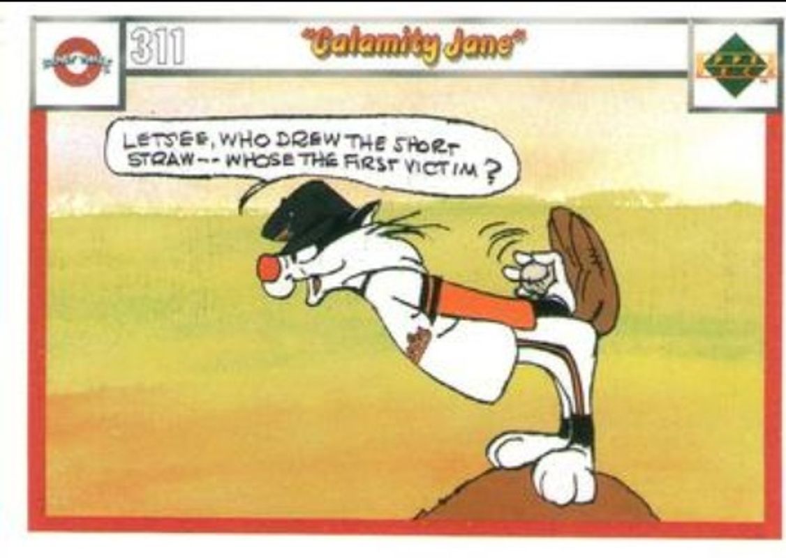 The Calamity Jane 1990 Upper Deck Comic Ball #311-/-320 Base card is 1 of 9 Calamity Jane's card variations in the 1990 Upper Deck Comic Ball set being tracked by Sports Card Investor, including #307-/-322 Base, #308-/-323 Base, #309-/-324 Base, #310-/-319 Base, and #312-/-321 Base.