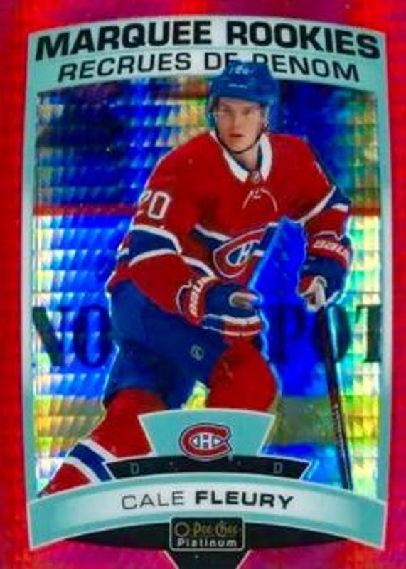 The Cale Fleury 2019 O-Pee-Chee Platinum #158 Red Prism /199 Rookie card is 1 of 18 Cale Fleury's card variations in the 2019 O-Pee-Chee Platinum set being tracked by Sports Card Investor, including Base, Matte Pink, Rainbow, Sunset, and Violet Pixels /399.