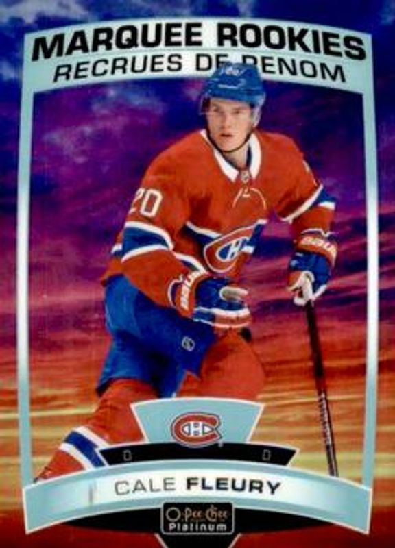 The Cale Fleury 2019 O-Pee-Chee Platinum #158 Sunset Rookie card is 1 of 18 Cale Fleury's card variations in the 2019 O-Pee-Chee Platinum set being tracked by Sports Card Investor, including Base, Matte Pink, Rainbow, Violet Pixels /399, and Red Prism /199.