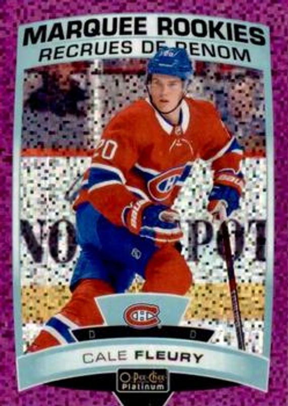 The Cale Fleury 2019 O-Pee-Chee Platinum #158 Violet Pixels /399 Rookie card is 1 of 18 Cale Fleury's card variations in the 2019 O-Pee-Chee Platinum set being tracked by Sports Card Investor, including Base, Matte Pink, Rainbow, Sunset, and Red Prism /199.