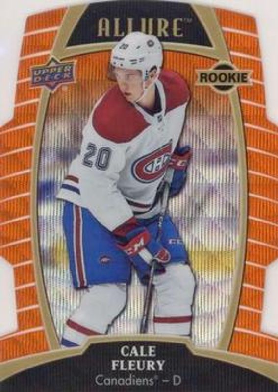 The Cale Fleury 2019 Upper Deck Allure #95 Orange Slice /199 Rookie card is 1 of 16 Cale Fleury's card variations in the 2019 Upper Deck Allure set being tracked by Sports Card Investor, including Base, Pewter, Red Rainbow, White Rainbow, and Yellow Taxi.
