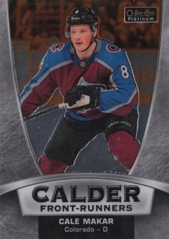 The Cale Makar 2019 O-Pee-Chee Platinum #CF-2 Calder Front Runners Rookie card is 1 of 39 Cale Makar's card variations in the 2019 O-Pee-Chee Platinum set being tracked by Sports Card Investor, including Base, Matte Pink, Pond Hockey, Rainbow, and Sunset.