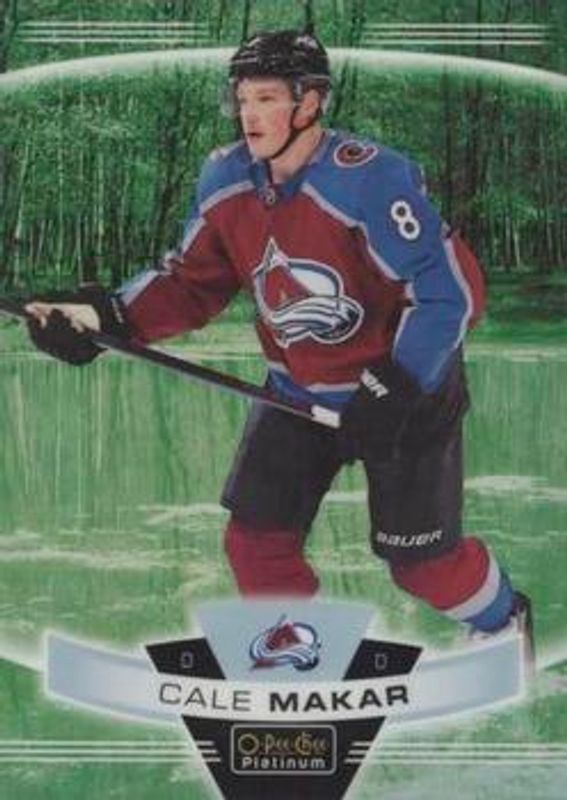 The Cale Makar 2019 O-Pee-Chee Platinum #175 Pond Hockey Green Rookie card is 1 of 39 Cale Makar's card variations in the 2019 O-Pee-Chee Platinum set being tracked by Sports Card Investor, including Base, Matte Pink, Pond Hockey, Rainbow, and Sunset.
