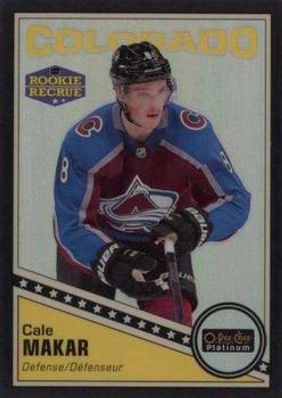 The Cale Makar 2019 O-Pee-Chee Platinum #R-84 Retro Black Pack Wars Rookie card is 1 of 39 Cale Makar's card variations in the 2019 O-Pee-Chee Platinum set being tracked by Sports Card Investor, including Base, Matte Pink, Pond Hockey, Rainbow, and Sunset.