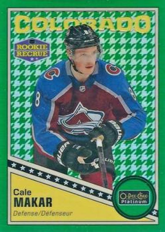 The Cale Makar 2019 O-Pee-Chee Platinum #R-84 Retro Green Houndstooth /15 Rookie card is 1 of 39 Cale Makar's card variations in the 2019 O-Pee-Chee Platinum set being tracked by Sports Card Investor, including Base, Matte Pink, Pond Hockey, Rainbow, and Sunset.