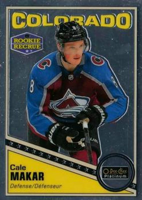 The Cale Makar 2019 O-Pee-Chee Platinum #R-84 Retro Rookie card is 1 of 39 Cale Makar's card variations in the 2019 O-Pee-Chee Platinum set being tracked by Sports Card Investor, including Base, Matte Pink, Pond Hockey, Rainbow, and Sunset.