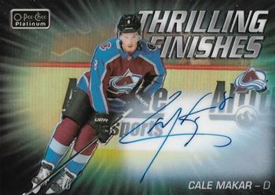 The Cale Makar 2019 O-Pee-Chee Platinum #TF-22 Thrilling Finishes Autographs Rookie card is 1 of 39 Cale Makar's card variations in the 2019 O-Pee-Chee Platinum set being tracked by Sports Card Investor, including Base, Matte Pink, Pond Hockey, Rainbow, and Sunset.