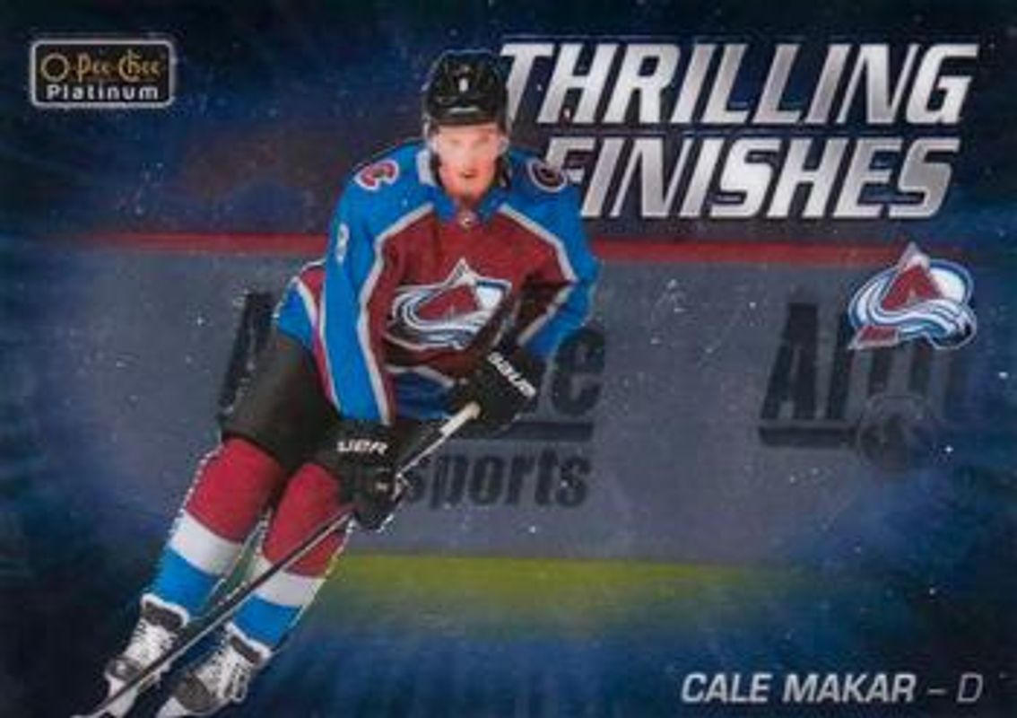 The Cale Makar 2019 O-Pee-Chee Platinum #TF-22 Thrilling Finishes Rookie card is 1 of 39 Cale Makar's card variations in the 2019 O-Pee-Chee Platinum set being tracked by Sports Card Investor, including Base, Matte Pink, Pond Hockey, Rainbow, and Sunset.