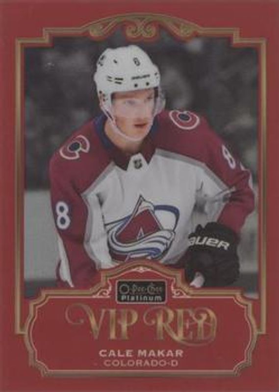 The Cale Makar 2019 O-Pee-Chee Platinum #VIPR-MA VIP Red /50 Rookie card is 1 of 39 Cale Makar's card variations in the 2019 O-Pee-Chee Platinum set being tracked by Sports Card Investor, including Base, Matte Pink, Pond Hockey, Rainbow, and Sunset.