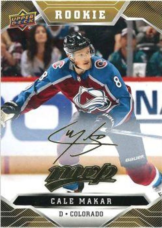The Cale Makar 2019 Upper Deck MVP #247 Gold Script Rookie card is 1 of 30 Cale Makar's card variations in the 2019 Upper Deck MVP set being tracked by Sports Card Investor, including #250 Base, #247 Base, #250 Blue, #247 Blue, and #250 Gold Script.