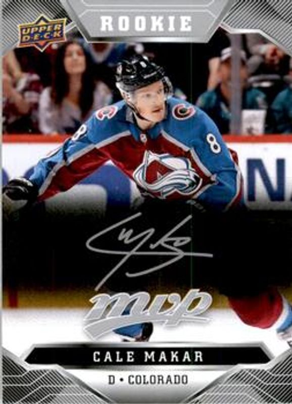 The Cale Makar 2019 Upper Deck MVP #247 Silver Script Rookie card is 1 of 30 Cale Makar's card variations in the 2019 Upper Deck MVP set being tracked by Sports Card Investor, including #250 Base, #247 Base, #250 Blue, #247 Blue, and #250 Gold Script.