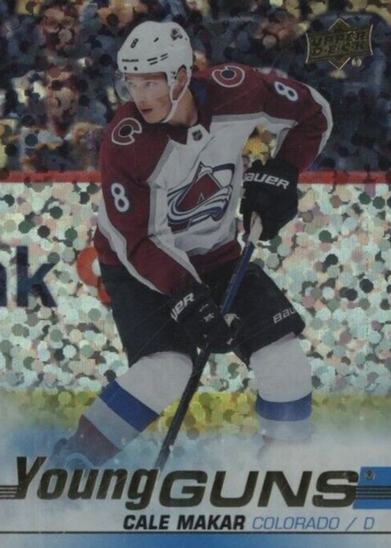 The Cale Makar 2019 Upper Deck #493 Young Guns - Speckled Rainbow Foil Rookie card in Raw condition has not changed in price in the last 30 days and was last sold for $805.00 .
