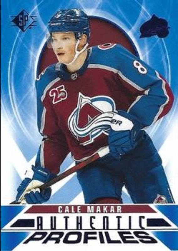 The Cale Makar 2020 SP #AP-8 Authentic Profiles - Blue card is 1 of 14 Cale Makar's card variations in the 2020 SP set being tracked by Sports Card Investor, including Base /2299, Blue, Authentic Profiles Jersey, Authentic Profiles - Pyrotechnic Gold, and Authentic Profiles Signatures.