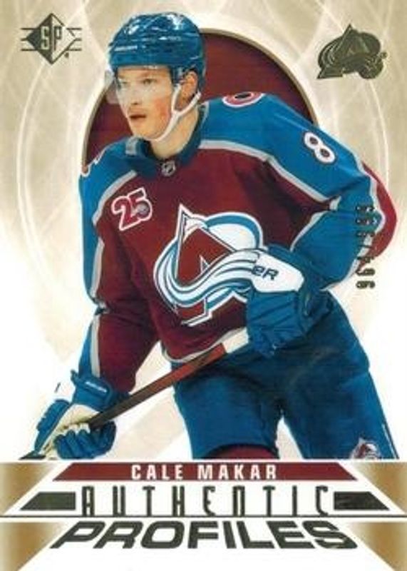 The Cale Makar 2020 SP #AP-8 Authentic Profiles - Gold /999 card is 1 of 14 Cale Makar's card variations in the 2020 SP set being tracked by Sports Card Investor, including Base /2299, Blue, Authentic Profiles - Blue, Authentic Profiles Jersey, and Authentic Profiles - Pyrotechnic Gold.